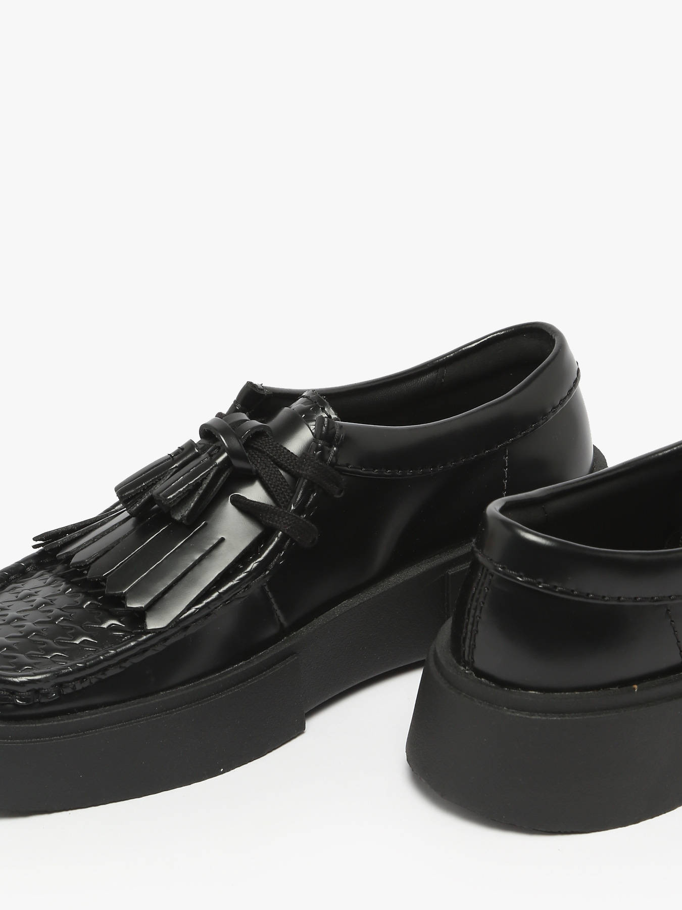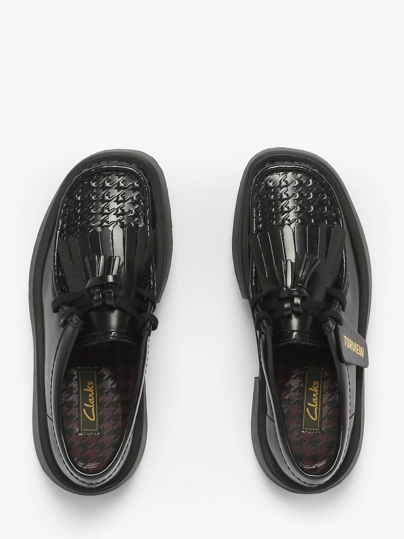 The Clarks Torview shoes combine casual style with a contemporary edge. Crafted from premium black leather, they feature an elegant design enhanced by a removable kiltie fringe on top and a detachable tassel, allowing for a personalized look. Their chunky and durable outsole gives them a bold, modern aesthetic, ideal for everyday wear. Equipped with a molded Contour Cushion footbed, they deliver outstanding comfort with every step, while the breathable leather lining and insole ensure a pleasant feel throughout the day. To complete the design, the pair comes with a branded Clarks keychain, adding a distinctive and timeless finishing touch.